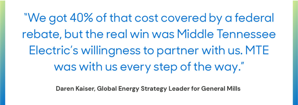 Daren Kaiser, Global Energy Strategy Leader for General Mills, says, “We got 40% of that cost covered by a federal rebate, but the real win was Middle Tennessee Electric’s willingness to partner with us. MTE was with us every step of the way. They probably worked harder than our contractors to make sure it came together. That kind of partnership makes innovation possible.”